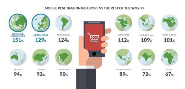 Globalmente in Europa Occidentale, il tasso di penetrazione del mobile è del 129%, cio`posiziona questa zona geografica in seconda posizione mondiale, dietro l’Europa centrale e Orientale. Questi dati confermano il potenziale dell’m-commerce e la necessità per i marketers di adattarsi a tale tendenza.
