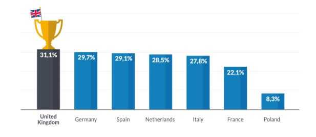 Il nostro studio ha dimostrato che i consumatori britannici sono quelli che acquistano maggiormente sul mobile. In modo sorprendente, l’Italia si posiziona al quinto posto, sebbene sia il terzo mercato e-commerce in Europa. Il mobile rappresenta il 27,8% del traffico e-commerce: l’utilizzo dei dispositivi mobili è meno sviluppato rispetto a paesi come la Germania, la Spagna, ed i Paesi Bassi.