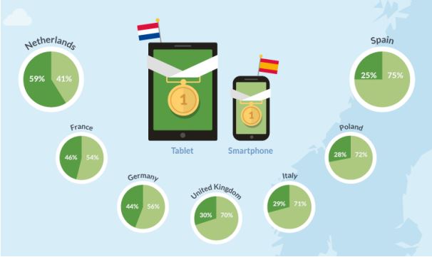 Complessivamente, nei paesi europei in questione, gli Smartphone sono più popolari dei tablet. Da notare che un paese che prende le distanze da questa tendenza sono i Paesi Bassi, dove il 59% del traffico mobile proviene dai tablet. In Italia, i consumatori si posizionano tra i migliori utilizzatori di tablet: gli Smartphone rappresentano il 71% del traffico mobile contro il 29% dei tablet. I recenti modelli di Smartphone sono forniti di schermi più grandi, che rendono più pratici gli acquisti e perciò tali dispositivi restano i più popolari.