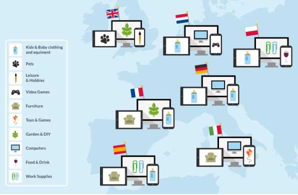 Sugli Smartphone, la categoria più popolare in Europa è quella che comprende i prodotti per bambini. In Italia, questa categoria è ugualmente la più popolare sugli Smartphone, davanti ai gioielli. Le categorie più popolari in Italia sui tablet sono i mobili ed i prodotti per i bambini, mentre sui dispositivi fissi i prodotti informatici e le forniture. La tipologia di prodotti consultati ed acquistati varia secondo i dispositivi: mentre i computer sono più utilizzati per gli acquisti tecnici (forniture, burotica), gli Smartphone e i tablet sono utlizzati per i prodotti più visivi (abbigliamento, giochi, gioielli).