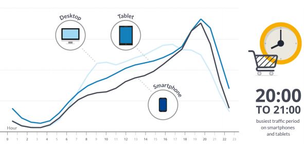 Infine, abbiamo studiato l’ora durante la quale i consumatori di questi 7 paesi effettuano acquisti online. Osservando i dati, possiamo notare un picco di traffico sui dispositivi mobili tra le ore 20 e le ore 21. In questo arco di tempo, i tablet sono più utilizzati rispetto agli Smartphone. Si può supporre che durante queste ore i consumatori approfittano del tempo libero per navigare dal loro domicilio con i dispositivi mobili.