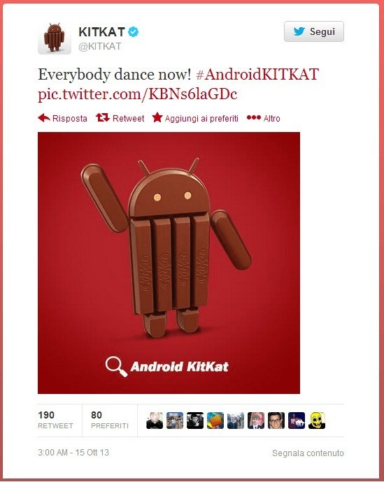 L’attesa per l’uscita del nuovo Nexus 5 e della nuova release Android 4.4 KitKat, rende impaziente gli utenti. Ad alimentare questa impazienza, e l’ipotesi di una data di uscita, ci pensa la pagina ufficiale KitKat su Twitter. Poco tempo fa infatti era stato pubblicato un cinguettio che recitava “Everybody Dance Now!” titolo di una celebre canzone. Subito i followers hanno visto in questo cinguettio, un messaggio che celerebbe la data di uscita del nuovo sistema operativo. La canzone, uscita il 18 Ottobre 1990, guarda caso dura esattamente 4 minuti e 4 secondi. I sostenitori delle teorie complottistiche hanno subito associato la durata in minuti ad Android 4.4 e la data di pubblicazione della canzone alla presentazione Google che potrebbe tenersi il 18 ottobre, ovvero venerdì.
