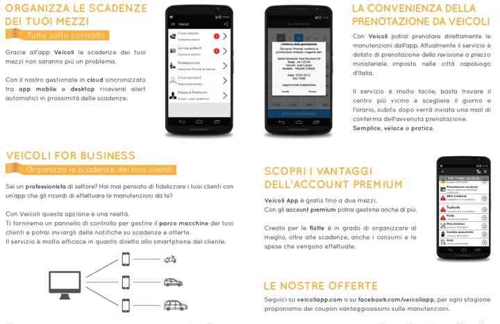 Il nostro secondo prodotto è Veicoli for Business (online da pochi mesi), una piattaforma web dedicata esclusivamente ai professionisti di settore (centri revisione, officine, carrozzieri ed altri professionisti) tramite la quale il professionista può gestire i propri clienti, avvisarli nel momento in cui voglia effettuare delle promozioni tramite notifica push, email ed sms e sostituire completamente il sistema di avviso in prossimità di scadenze, fatto oggi in forma manuale e cartacea: il prodotto avviserà in modo automatico, tramite un algoritmo proprietario, i clienti del professionista tramite email e notifica push (per chi userà Veicoliapp) andando ad automatizzare il processo (il 90% dei professionisti spedisce ancora a mano la lettera per avvisare il cliente al momento della revisione) e andando così a ridurre lo spreco di carta e tempo.