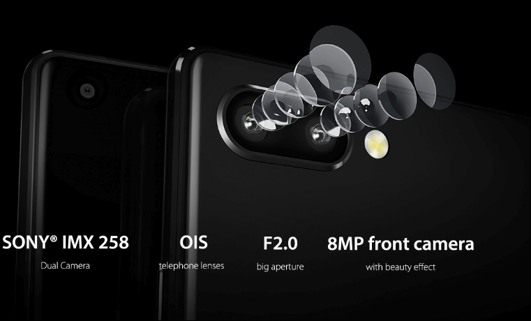 Lo smartphone è dotato di una doppia fotocamera sul retro da 13 megapixel con apertura focale f/2.0, mentre nella parte frontale dispone di una fotocamera da 8 megapixel con effetto beauty. Inoltre, nella parte posteriore è collocato il sensore per le impronte digitali che dovrebbe sbloccare il device in 0.1 secondi.