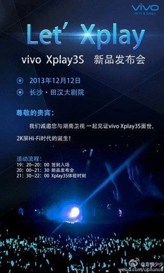 La casa produttrice cinese Vivo sta realizzando un lancio pubblicitario senza paragone per il proprio nuovo top di gamma Xplay 3S che da quanto trapelato sarà un dispositivo dalle caratteristiche straordinarie e completo sotto ogni punto di vista, che vorrebbe addirittura andare ad insidiare prodotti quali Galaxy S4 ed iPhone nelle vendite, e che come annunciato da Vivo stesso verrà presentato il 12 Dicembre prossimo in un apposito evento.