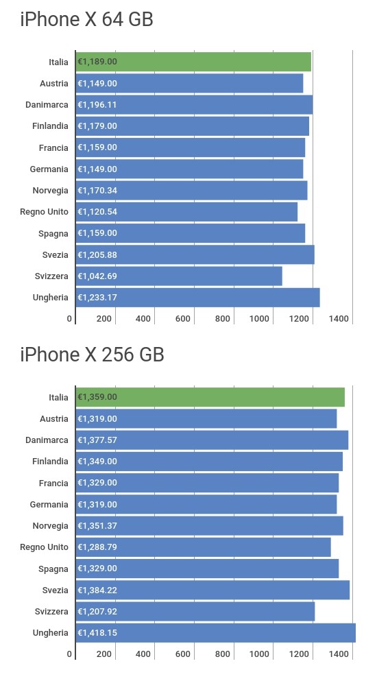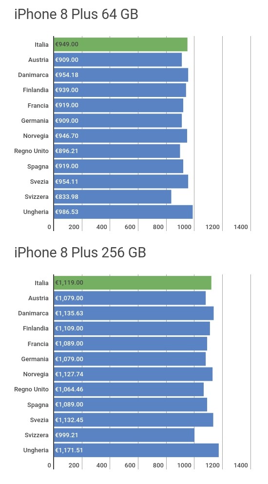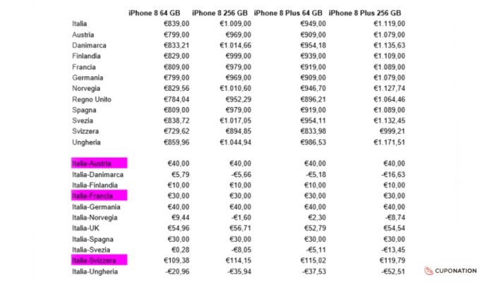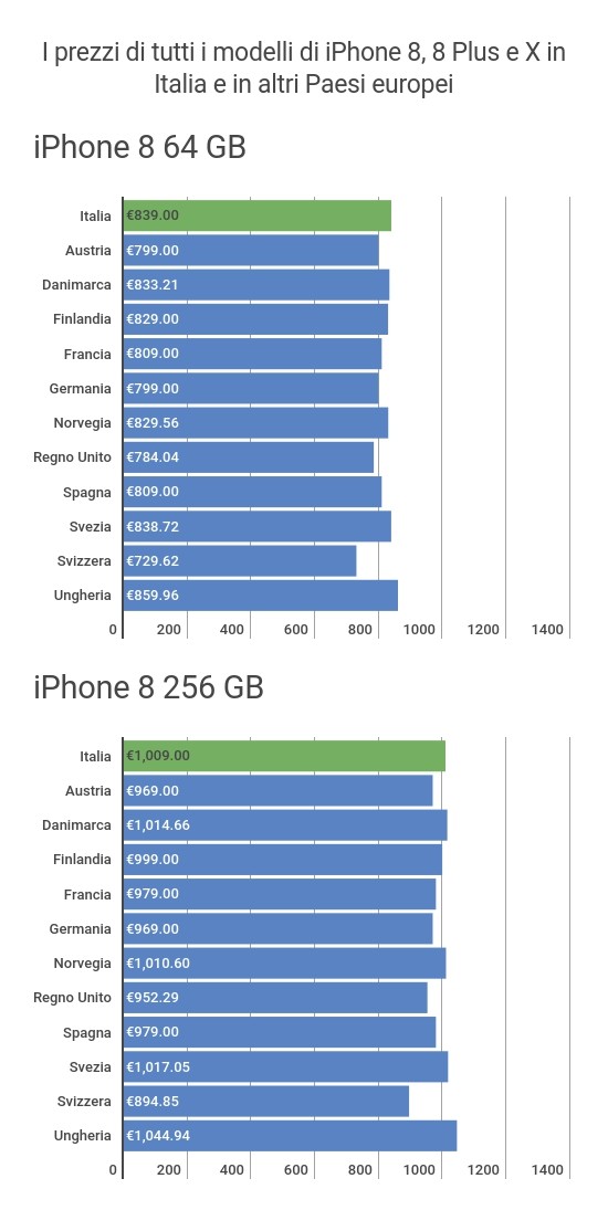 Addirittura in determinate occasioni sarebbe più economico fare un viaggetto a Londra, trovando ovviamente l’occasione, e comprare iPhone 8 o iPhone X li piuttosto che prenderli in casa. Di seguito presente anche una dettagliatissima infografica con tutti i dati specifici del caso: