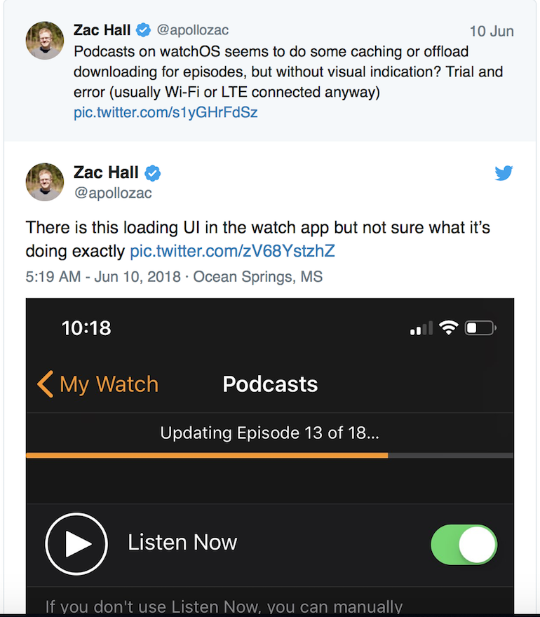 Nella notte tra martedì e mercoledì sono apparsi in rete alcune informazioni sull’effettivo funzionamento dei podcast su watchOS 5. Ad esempio, l’account Twitter ufficiale di Pocket Casts ha riportato la possibilità di scaricare i podcast direttamente su Apple Watch, mentre non sarà consentito lo streaming diretto dal dispositivo. Zac Hall ha sperimentato la prima beta del nuovo aggiornamento software e ha condiviso parte della sua esperienza di sincronizzazione dei podcast utilizzando l’app nativa sul proprio account Twitter.