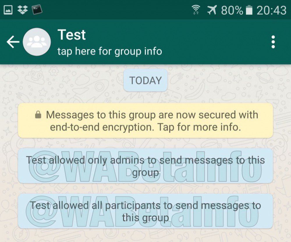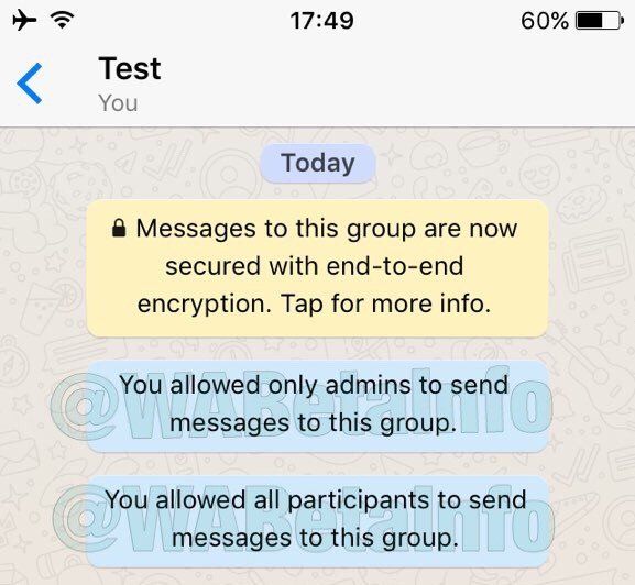 Funzione che strizza un po’ l’occhio ai Canali di Telegram, utili per ottenere notizie o comunicazioni importanti. Forse WhatsApp, nel tentativo di emulare la concorrente, sta cercando di implementare qualcosa di simile utilizzando le chat di gruppo. Quando gli admin disattiveranno la chat agli utenti base, una notifica apparirà all’interno del gruppo. Gli amministratori stessi potranno cambiare questa impostazione solamente ogni 72 ore.