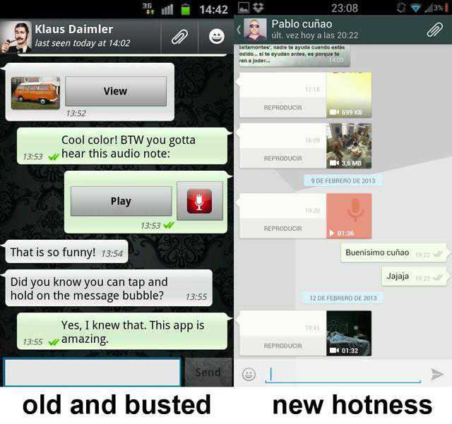 La nuova interfaccia chiamata Holo, risulta più pulita e curata, sono stati ridisegnati i menù nella chat sono state migliorate le anteprime dei file media. Le immagini sono ora più visibili grazie all’anteprima ingrandita. Il nome Holo, non è stato scelto a caso, infatti, introdotto con Ice Cream Sandwich, Holo è sinonimo della nuova grafica del sistema operativo di Google, che ormai risulta presenti nella maggior parte degli smartphone di ultima generazione e che rende visibilmente più bello l’intero sistema agli occhi degli utenti Android.