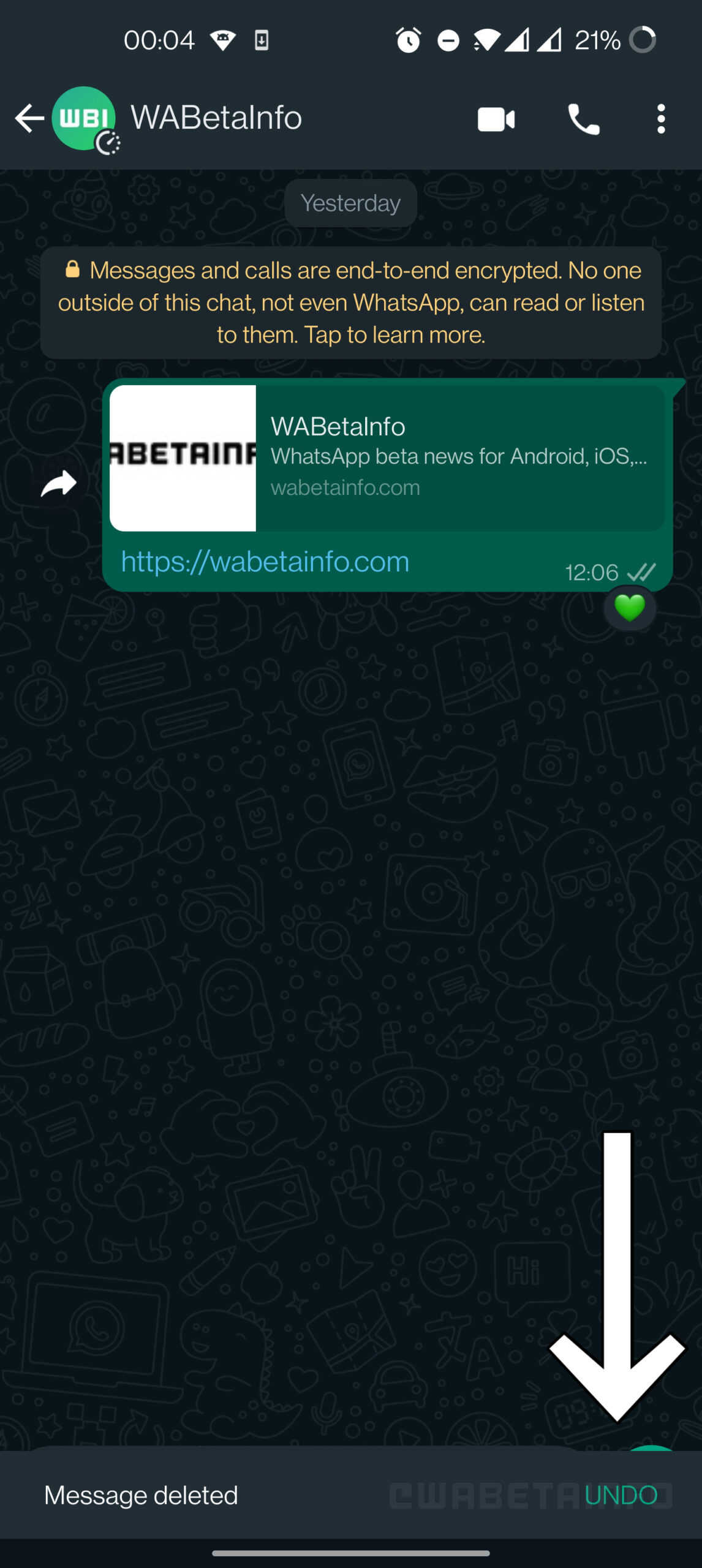 Come si può vedere in questo screenshot in alto, dopo aver eliminato un messaggio toccando “elimina per me”, WhatsApp presenta una barra nella parte inferiore dello schermo che permette di ripristinare il messaggio: quando la funzione verrà rilasciato al pubblico, l’utente avrà pochi secondi per annullare il processo.