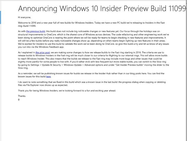 “Come avvenuto con la precedente build appartenente al ramo di sviluppo RS1, anche in questa non ci sono cambiamenti evidenti o nuove caratteristiche. La nostra attenzione durante il periodo delle feste si è incentrato su miglioramenti strutturali di OneCore, il nucleo di Windows condiviso tra i vari device. Sia il refactoring del codice che altri lavori di ingegnerizzazione effettuati per ottimizzare OneCore consentiranno a breve ai vari team di sviluppo di apportare nuove funzionalità e miglioramenti. Saranno necessarie ancora un paio di build prima che ci siano modifiche evidenti a seconda di quando i team attiveranno le nuove funzionalità nelle loro aree di interesse. Siamo entusiasti del fatto che gli insider possano utilizzare questa build per verificare il lavoro che abbiamo fatto su OneCore. Provate quindi questa build e fateci sapere di eventuali problemi tramite l’applicazione Windows Feedback.”– Gabe Aul