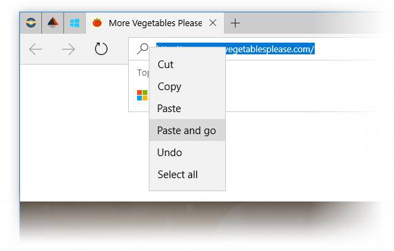 Ancora in Edge, troviamo la funzionalità copia ed “Incolla e vai“, già utilizzata da tempo su browser della concorrenza e che consente di incollare un indirizzo web nella barra degli indirizzi ed avviare in modo immediato il caricamento della pagina. In Edge è ora presente anche “Incolla e cerca” che in modo simile a quanto descritto prima consente di avviare immediatamente la ricerca sul web di ciò che è stato incollato nella barra degli indirizzi.