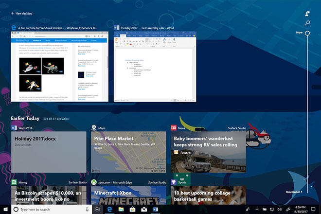 Partendo proprio da Timeline, si tratta di un nuovo modo di riprendere le attività precedenti avviate sul PC e su altri PC Windows e dispositivi iOS / Android. Timeline (in gergo proprio “cronologia”) migliora il multitasking, consentendo di passare da app in esecuzione ad attività passate. Come può evincersi dalla screenshot in apertura, Microsoft ha ristrutturato la grafica generale: in prima battuta troviamo i processi in esecuzione (Microsoft Edge e Microsoft World, nel caso dell’immagine), mentre immediatamente sotto sono posizionate le attività precedenti. La schermata mostra le attività quotidiane più significative, ma l’utente potrà avere modo di spostarsi (tramite cursore laterale) su quelle precedenti opportunamente ordinate per data. E per suggellare l’esperienza utente figura altresì una casella di ricerca: in soldoni, si potrà cercare direttamente l’attività desiderata, senza perder troppo tempo nello scorrere della pagina. Rilevante è il supporto a Cortana.