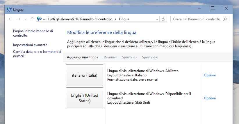 Da Pannello di controllo > Lingua impostare come lingua principale (aggiungendola e portandola su) English (United States), e scaricando anche la relativa Lingua di visualizzazione