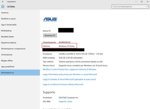Potete controllare l’edizione di Windows 10 già installata sul vostro PC, accedendo a ‘Impostazioni di sistema’ -> ‘Sistema’ -> ‘Informazione su’ -> Edizione.
