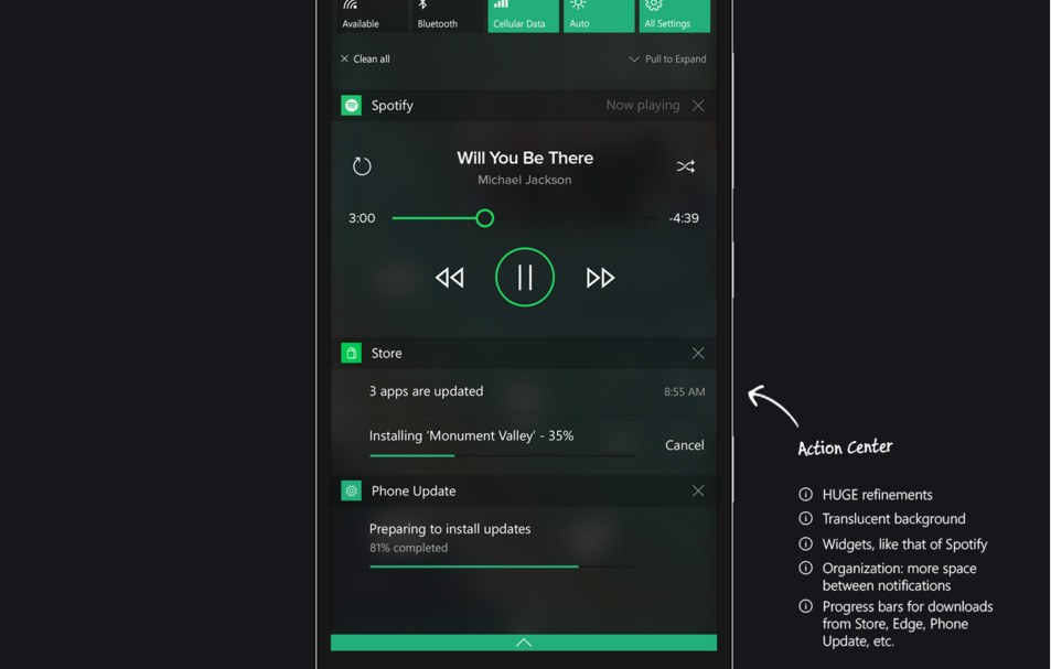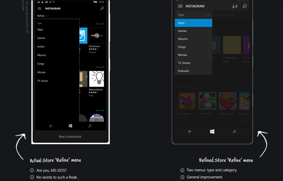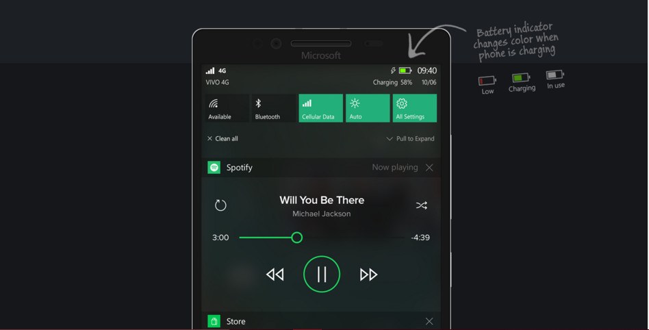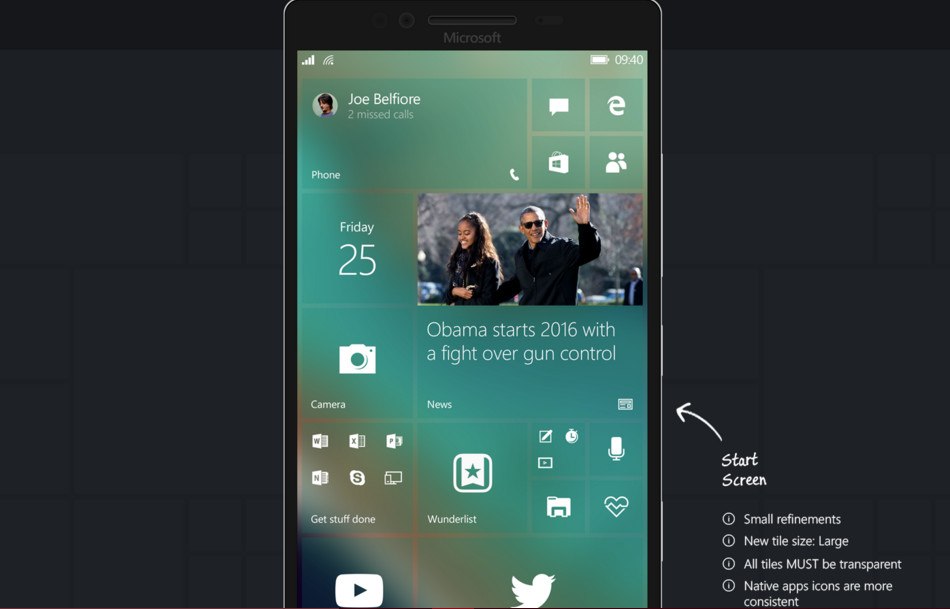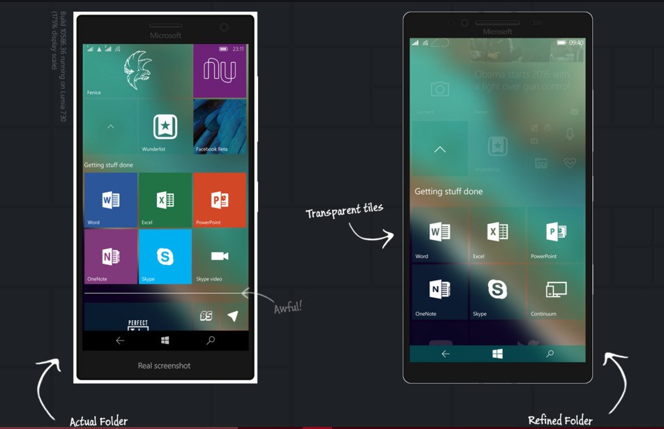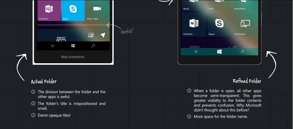 Queste immagini che ritraggono una versione artistica di Windows 10 Mobile che mostrano il sistema operativo privo di alcuni difetti attualmente presenti. Il grafico ha inoltre deciso tramite didascalie, di spiegare le varie funzionalità, le migliorie apportate e quelle che dovrebbero essere aggiunte. Dalle immagini prodotte si notano dei piccoli miglioramenti sostanziali alla schermata iniziale con l’inserimento delle “live tiles” più grandi, interattive e trasparenti. E’ stata sostituita la grande ed a volte fastidiosa barra di ricerca con un più comodo tasto. Alcuni elementi hanno lo sfondo trasparente mentre l’applicazione Windows Store, centro di notifiche, il sistema multitasking, la pagina di sistema ed altri menù di sistema hanno come colore di sfondo il grigio scuro. Sono state ottimizzate inoltre le dimensioni e le distanze dei vari elementi.