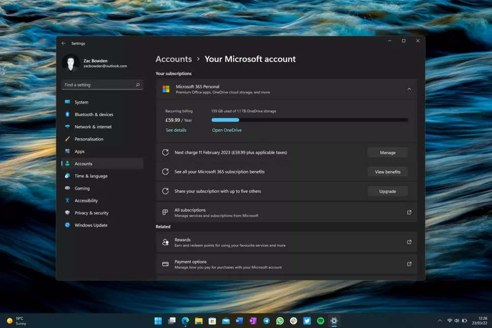 Come nel caso di ogni nuova versione di Windows, Microsoft ha aggiunto diverse nuove pagine delle impostazioni all’app Impostazioni con 22H2. È disponibile una nuova pagina Account Microsoft nell’area Account, che fornisce una panoramica dell’abbonamento a Microsoft 365, con accesso rapido ad altre impostazioni e servizi online. C’è anche una nuova pagina Family Safety nella stessa area, progettata per fornire un rapido accesso a tutte le opzioni di Family Safety se si utilizza quel servizio.