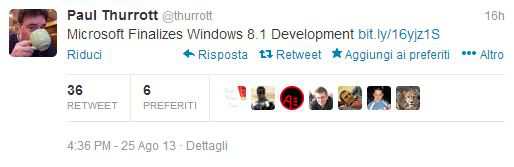 A quanto pare ci siamo davvero, Windows 8.1 ha completato la sua fase di messa a punto venerdì scorso ed è pronto a sbarcare presso i vari partner per prepararsi al lancio che avverrà il come da piano 17 ottobre. L’indiscrezione arriva ci arriva da un tweet di Paul Thurrott che rivela anche il numero della build RTM (release to manufacturing) 9600.16384.130821-1623.