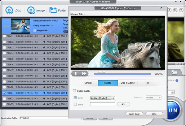 Oltre a quanto indicato, WinX DVD Ripper Platinum dispone anche di altre interessanti funzionalità che consentono di aggiungere sottotitoli, ritagliare immagini, effettuare il crop video per rimuovere eventuali bande nere ed altro ancora.