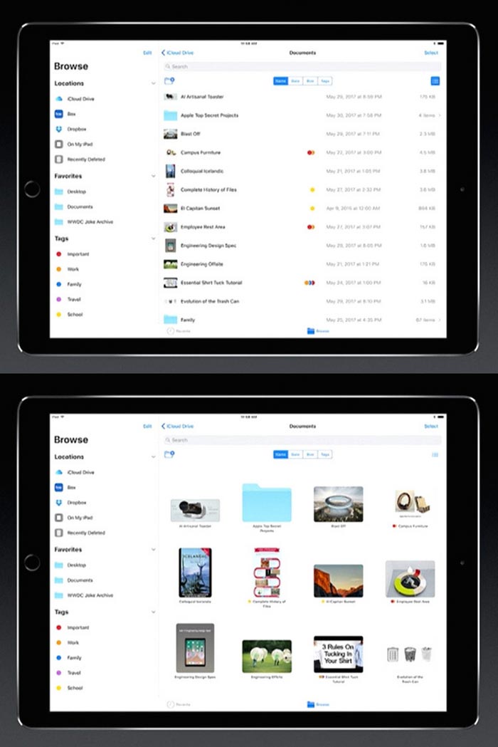 Dinanzi ad un sempre più netto incedere dei convertibili 2-in-1 con a bordo Windows 10, Apple insomma rilancia e lo fa mettendo in mostra tutta una serie di novità meramente improntate sul concetto cardine della produttività. Nel novero di queste spicca in modo inequivocabile la presenza di un file manager, alla sua prima apparizione su iOS allorché ufficializzato proprio ieri al WWDC 2017. La funzionalità in questione è relegata alla presenza di una applicazione ad-hoc denominata <<File>>, nello specifico un file manager integrato e realizzato proprio da Apple stessa: l’app sarà disponibile nella versione finale di iOS 11 ed avrà il compito di riunire in una sola direzione tutti i file inviati a mezzo iCloud Drive, servizi di terze parti come Box o Dropbox, oltre che documenti ed affini che abbiamo archiviato localmente sul dispositivo.