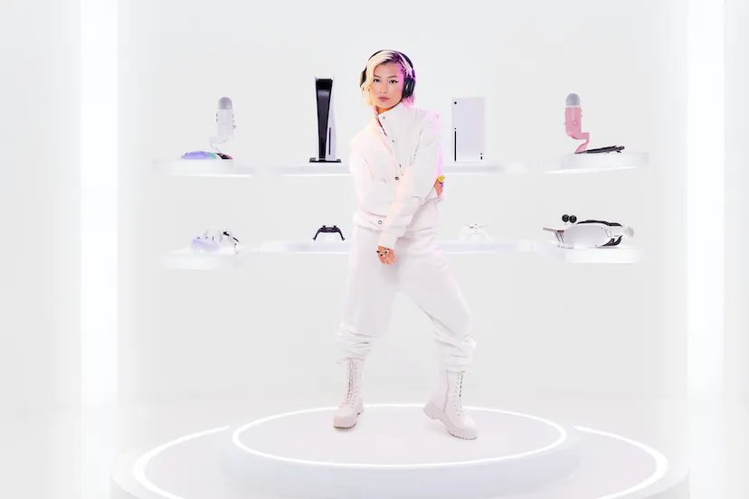 Lo spot mostra una Xbox Series X bianca insieme a una normale PS5 e i microfoni Blue Yeti bianchi e rosa che facevano parte di una collaborazione tra Logitech e Blue.
