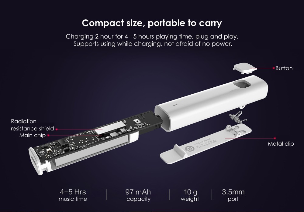 Presenta una piccola batteria interna da 97mAh che gli consente una riproduzione continua di 5 ore, e può essere ricaricato grazie alla presenza della porta micro-USB. Il bluetooth è di tipo 4.2 e per sfruttarlo basterà collegarlo al proprio Smartphone dopo averlo acceso grazie al pulsante presente su di esso.