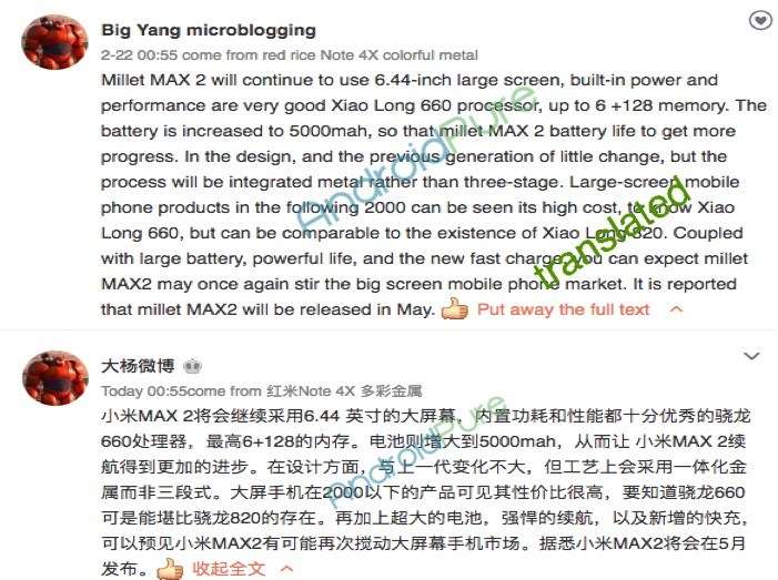 Dopo il successo del primo modello l’azienda Cinese è pronta a lanciare il nuovo Xiaomi Mi Max 2. Si tratta di un prodotto dalle dimensioni davvero generose (per contenerci) che potrebbe arrivare già il prossimo mese di maggio. Dal web sono trapelate le prime indiscrezioni sulla scheda tecnica del prodotto.