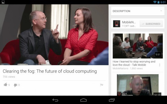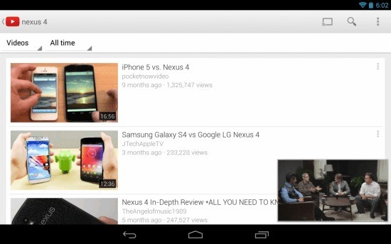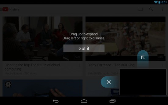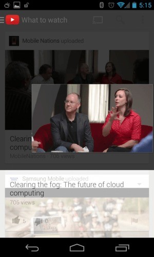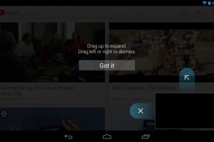 Ma le novità non interessano unicamente l’interfaccia grafica infatti YouTube per Android permette ora di visualizzare i video con il sistema multi-window che consiste in pratica nella possibilità di visionare un video riducendone le dimensioni a favore dell’interfaccia grafica di YouTube, in questo modo si riesce quindi a riprodurre un video e continuare la ricerca di altri video o la lettura di feed relativi a Youtube stesso.